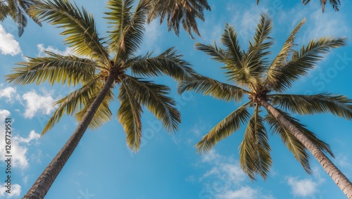 Palm trees against a blue sky with clouds viewed from below during daytime Copy Space