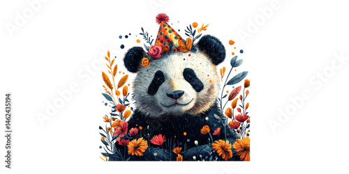Panda Wearing Party Hat Surrounded By Colorful Flowers. Celebration And Festive Illustration Isolated On Transparent Background