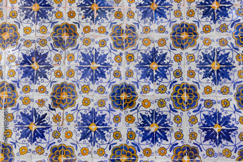 Panel with traditional blue and yellow Portuguese azulejos tiles with floral repeating motifs and patterns, decorative wall art, Toledo, Spain.