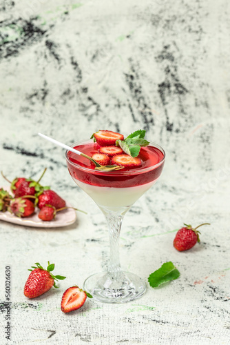 Panna cotta vanilla with strawberry sauce jelly and mint. Italian dessert, vertical image. top view. place for text