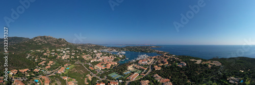 Panorama Centre of One of the most expensive resorts in the world. Aerial View of Porto Cervo, Italian seaside resort in northern Sardinia, Italy.