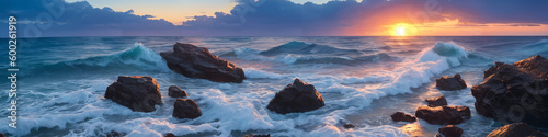 Panorama of a sunset over the ocean with waves crashing on the shore and several big stones in the water. Seascape illustration with sand beach, cloudy sky and setting sun. Generative AI
