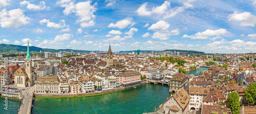 Panorama of Minster Fraumunster and St. Peter church with city center of Zurich, Switzerland - aerial view
