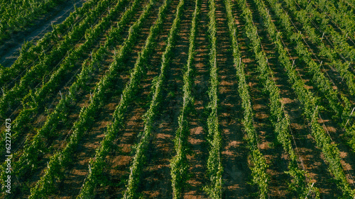 Panorama of the vineyard in Tenerife seen from the drone. Beautiful green landscape of straight rows, line pattern, growing grapes for red or rose wine