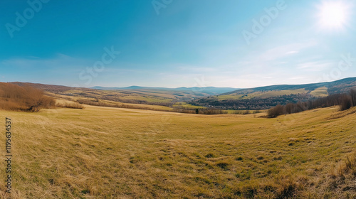 Panoramic Countryside with Rolling Green Hills and Bright Sunny Fields in a Tranquil Rural Landscape