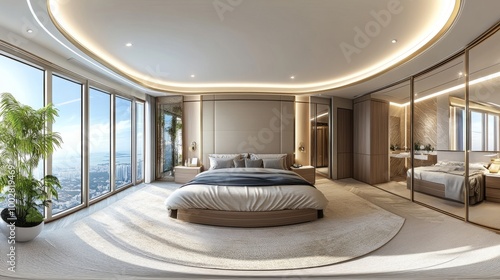 Panoramic equirectangular 360-degree view of a stylish studio apartment, featuring clear windows for sunlight.