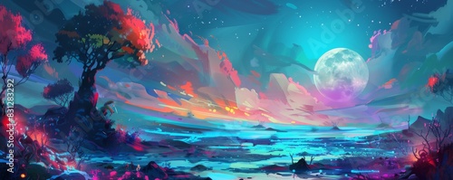 Panoramic illustration of a surreal, colorful fantasy world under a giant moon
