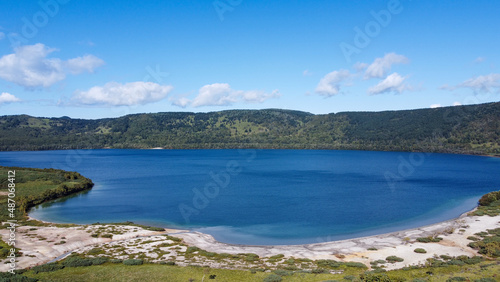 Panoramic image the Hot lake in caldera of Golovnin volcano on Kunashir Island, Kurils, Russia.