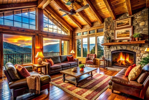 Panoramic Rustic Mountain Cabin Interior: Cozy Fireplace & Wooden Beams