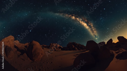 Panoramic shot of the Milky Way featuring a 3D cartoon rendering showcasing stars against a clean silhouette of rocks