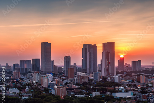 Panoramic skyline and modern commercial buildings with sunset views