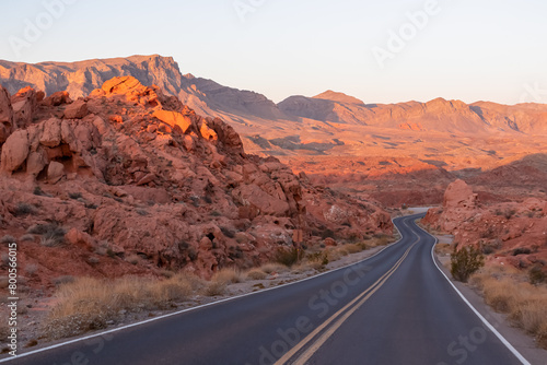 Panoramic sunrise view of endless winding empty road in Valley of Fire State Park leading to red Aztec Sandstone Rock formations and desert vegetation in Mojave desert, Overton, Nevada, USA. Freedom