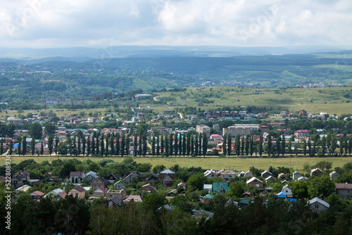Panoramic top view of the city of Kislovodsk in Russia with green trees and architecture through a misty haze on a sunny summer day and a sky with clouds