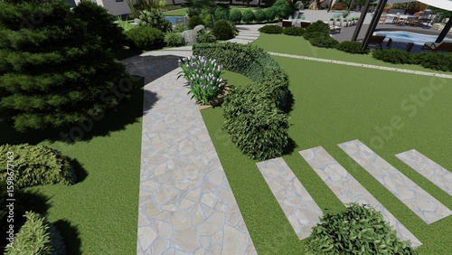Panoramic video of landscape design of a city garden. Panoramic view from a vantage point of the park landscape.