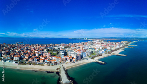 Panoramic view from a height above the town of Pomorie with houses and streets washed by the Black Sea in Bulgaria