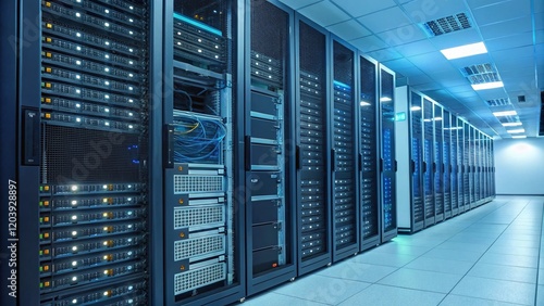 Panoramic View of a Data Center Server Room with Hard Drives