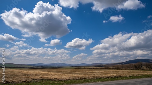 Panoramic view of a field, hills, and a vast blue sky dotted with puffy white clouds