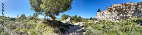 Panoramic view of a path with trees and bushes up the hill in the urban area of Igualada near Barcelona, Spain