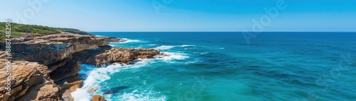 Panoramic view of a rocky coastline against a blue sky and crystal clear ocean waters on a sunny day. Perfect for travel and nature inspirations.