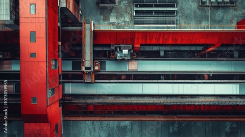 Panoramic view of a roofing factory, showcasing the production line on top with metal sheets moving through cutting and forming stations.