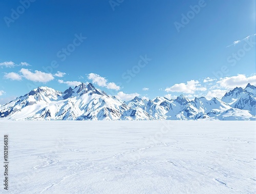 Panoramic view of a snow-covered mountain range with a frozen lake, winter, icy terrain, snow, white background