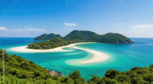 Panoramic view of a tropical bay with a pristine white sand beach curving into turquoise water. Lush green hills and islands surround the bay. Sunny, clear sky