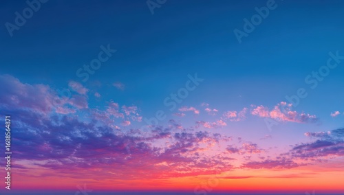 Panoramic view of a vibrant sunset sky. Clouds of varying shades of pink, orange, and purple are spread across the lower portion of the vast blue sky