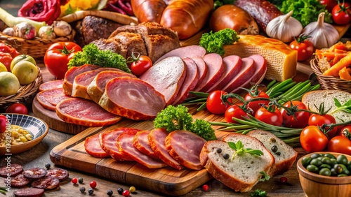 Panoramic View of Abundant Deli Meat, Bread, and Vegetable Slices for Catering or Buffet