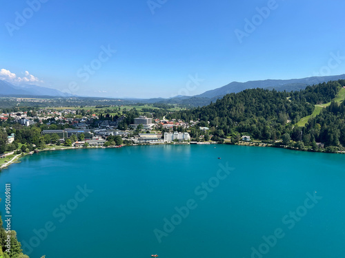 Panoramic view of Bled settlement and on Lake Bled (Blejsko jezero, Bleder See oder Veldeser See) from the castle of Bled (Blejski grad) - Bled, Slovenia