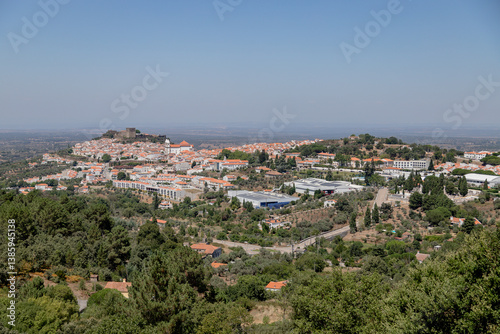 Panoramic view of Castelo de Vide, a historic village in Alentejo, Portugal, captured on a clear summer day from a scenic viewpoint, highlighting the medieval castle and white houses with red roofs.