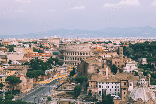 Panoramic view of city Rome with Roman forum and Colosseum from Vittoriano