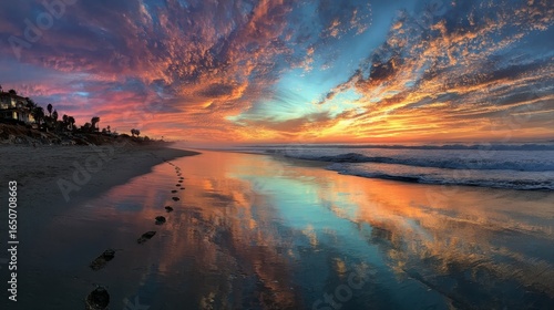 Panoramic View of Empty Public Beach at Dawn with Colorful Sky