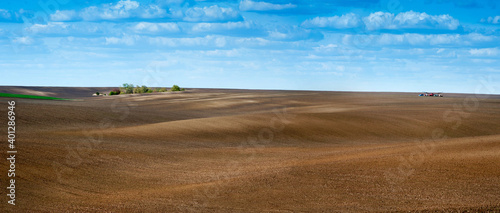 panoramic view of fields prepared for sowing, smooth lines on hilly terrain in spring with cloudy sky