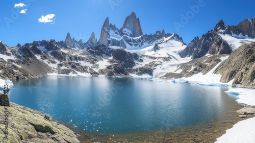 Panoramic view of Fitz Roy mountain range reflected in a glacial lake.