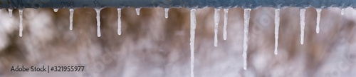panoramic view of icicles on snow bokeh background. icicles on a metal crossbar