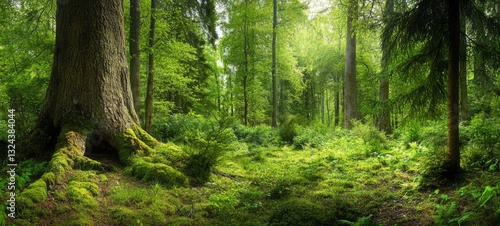 Panoramic view of lush mixed forest landscape in Black Forest showcasing birch, beech, and fir trees with green moss