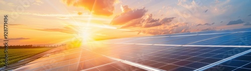 Panoramic view of solar panels capturing sunset energy, representing renewable energy and sustainable practices for a green future.