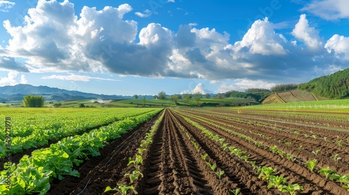 Panoramic View of Sustainable Grain Farm with Diverse Crops and Natural Irrigation Systems