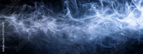 Panoramic view of the abstract fog. White cloudiness, mist or smog moves on black background. Beautiful swirling gray smoke. Mockup for your logo. Wide angle horizontal wallpaper or web banner.