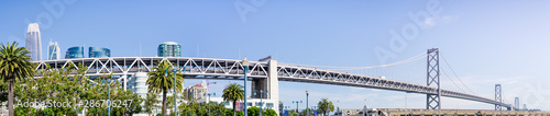 Panoramic view of the Bay Bridge spanning from the Financial District to Treasure Island on a sunny and clear day, San Francisco, California