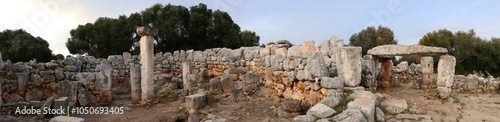 Panoramic view of the sunset in Torre d'en Galmés talayotic settlement. The largest settlement in Menorca. Three talaiots standing on top of the hill, plus the taula. Bealearic islands