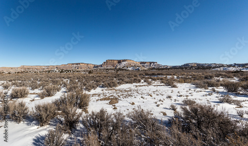 Panoramic view of wide open desert vista covered in snow with mountain range on clear day in rural New Mexico