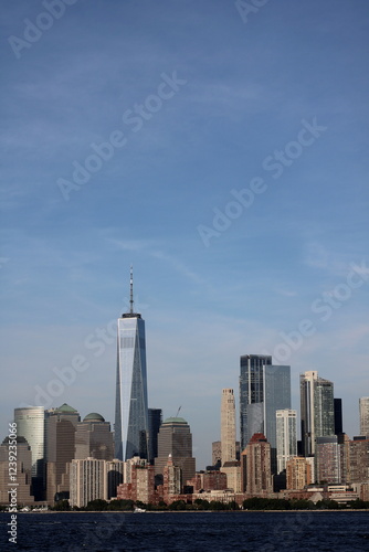 Panoramiczny widok Nowego Jorku z ujęciem rzeki, uchwycony w pionie, z pełną panoramą miasta i odbiciem w wodzie.