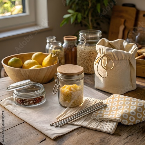 Pantry Ingredients Stored in Glass Jars and a Linen Bag on Wooden Surface