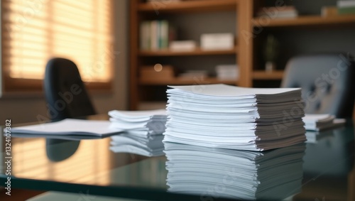 Paper business documents stacked on an office desk for archiving, analyzing the market, and considering future profit sizes on the office table.