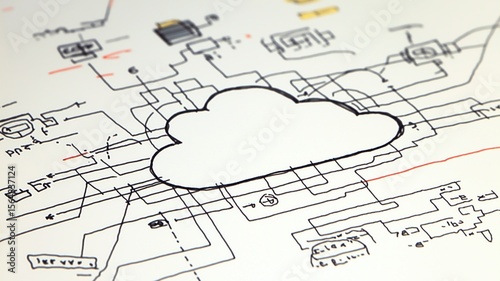 Paper cloud icon on retro abstract circuit diagram representing modern cloud computing and digital data technology integration, vintage magazine print