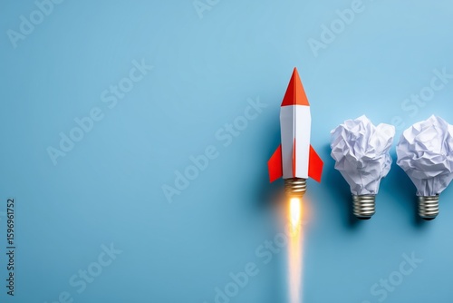 Paper rocket taking off with crumpled paper light bulbs beside it on blue background, symbolizing creativity, innovation and business breakthrough