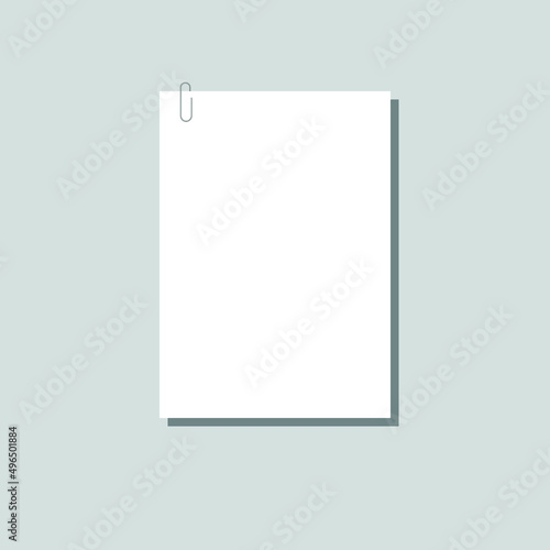 Paper sheet in A4 format with metal clip on light grey background. Notebook page. Vector illustration