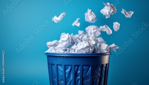 paper waste falling into bin crumpled paper falling into a dark blue trash can against a light blue background symbolizing discarding ideas mistakes or the end of a project