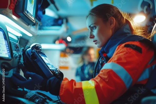 Paramedic administering defibrillator for patient safety ambulance interior emergency medical response nighttime environment close-up viewpoint life-saving concept